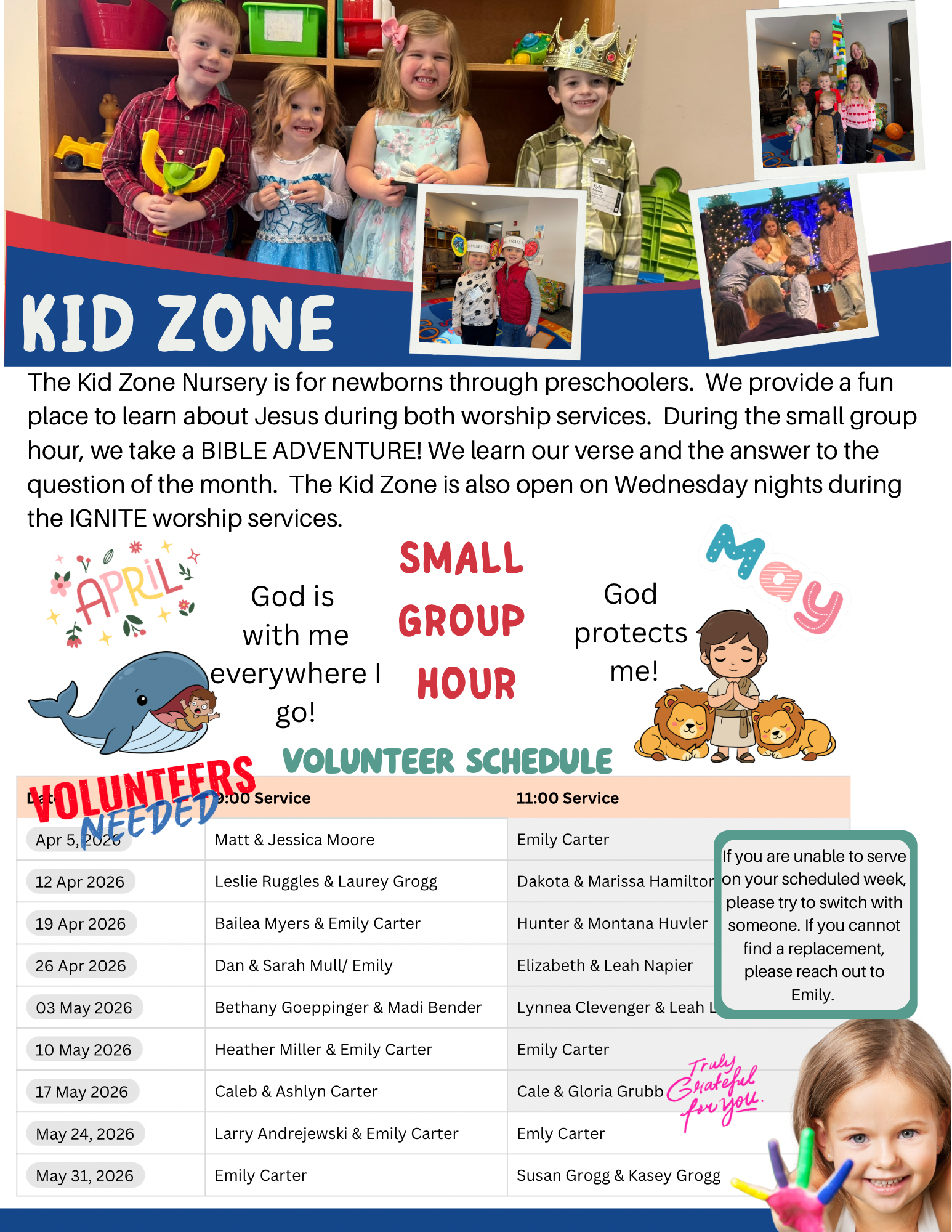Our nursery ministry allows parents of Infant-Preschool children to worship, knowing their children are being cared for as they learn about Jesus.