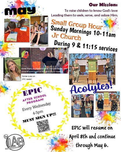 Promotes programs for children ages Kindergarten-5th grade: including Small Group and Jr. Church on Sunday mornings, our Wednesday after school program called EPIC, and our summer program Tuesdays Afternoon Fun For You, TAFFY.